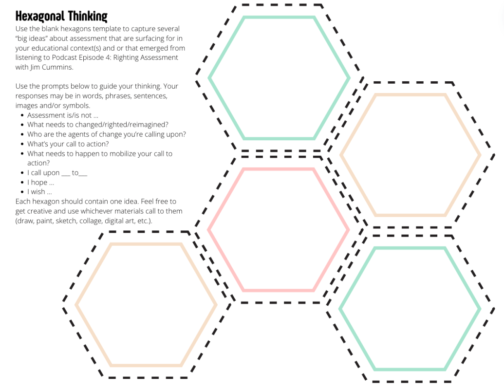 Invite conversation participants to use our blank hexagons template to capture several “big ideas” about assessment that are surfacing for them in their educational context(s) and or that emerged from listening to one of our podcasts. This may be an idea that has moved them, provoked them, challenged them, and/or inspired them.