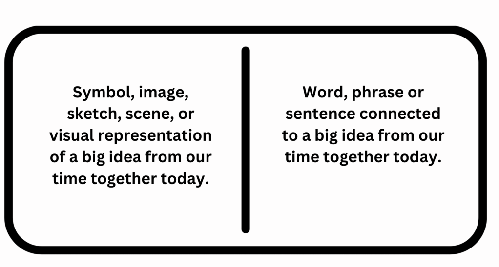 On one half of the blank domino template, participants will create a visual representation of their “big idea” about assessment in the form of a symbol, image, sketch, or scene. On the other half of the domino, participants will add a word, phrase, sentence, or quotation.