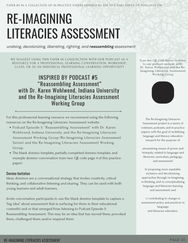 We suggest using In-Practice Paper #5- Reassembling Assessment in conjunction with following Re-Imagining Literacies Assessment professional learning resources: